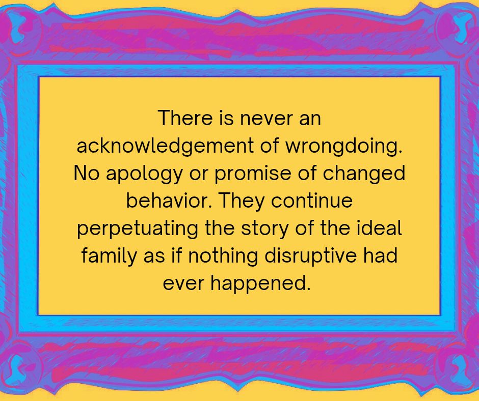 In practice within an unhealthy family, the rule of no repair means that anyone in the family can do anything they want. There is usually one leader who has the most power and control, and they cannot be questioned at all. Their word is law. The other members fighting amongst themselves can lash out, explode in anger, tell lies, get wasted, or talk all kinds of shit about each other. There is never any acknowledgement of wrongdoing, apology, or promise of changed behavior. There might be some drunken “I love you.” Then they continue perpetuating the story of the ideal family as if nothing disruptive had ever happened.