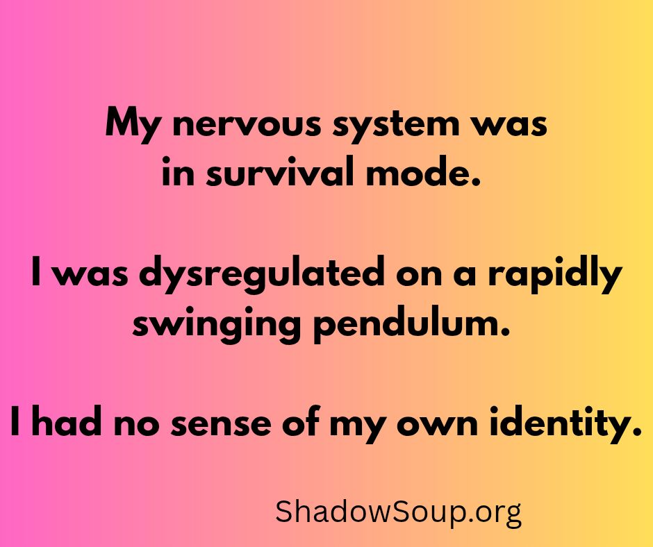 in survival mode: I had no immune system, I had no digestive cues like hunger or satiety, I was dysregulated on a rapidly swinging pendulum, and I had no sense of my own identity.